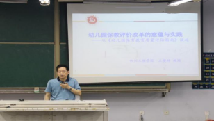 王燮辞教授首先介绍了《幼儿园保育教育评估指南》的出台背景及意义。他指出,该指南以习近平新时代中国特色社会主义思想为指导,旨在将学前教育发展逐步纳入制度化、法治化轨道,加快建立健全学前教育评估制度,促进学前教育高质量发展。随后,王燮辞教授简单介绍了《幼儿园保育教育评估指南》的具体内容,重点强调评价的目的是促进儿童的全面发展,在评估的过程中要通过观察理解幼儿的学习方式、特点和规律,将幼儿园自我评估与外部评估有机结合,注重以人为本、聚焦教育过程、突出师生互动、坚持科学评估。最后,王燮辞教授向大家介绍了评估方式,希望同学们能在以后的学习工作中树立科学评价导向、坚持以儿童为本、坚持以评促建,落实立德树人的根本任务。