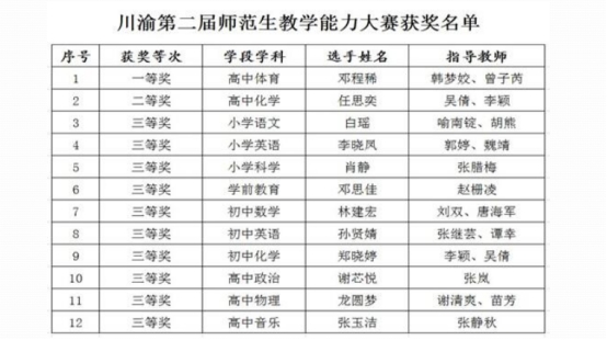 在近日落下帷幕的川渝第二届师范生教学能力大赛中,公司白瑶、李晓凤、肖静、邓思佳四名同学经过长时间的备战和激烈角逐,凭借出色的表现和实力,斩获省赛三等奖佳绩。